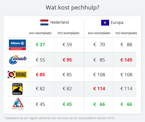 Allianz en ANWB rekenen extra kosten voor pechhulp in je eigen woonplaats. Bij Bovag, Routemobiel en SOS Pechhulp valt jouw eigen woonplaats gewoon onder de Nederland-dekking.