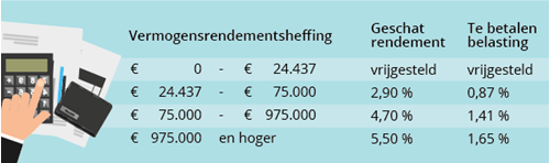 Vanaf 1 januari wordt de grens vanaf wanneer je belasting verschuldigd bent verhoogd. Dat was € 21.330 en wordt € 24.437 per persoon (het dubbele voor partners). Het rendement waarmee gerekend wordt, verandert ook. Dat is lager bij kleinere vermogens en loopt op naarmate de spaarrekening groter is.