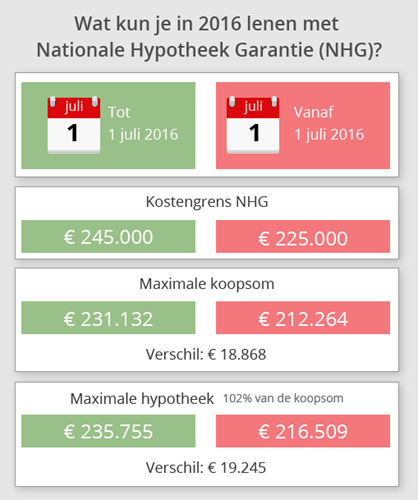 Zoals ieder jaar, wordt ook in 2016 de kostengrens voor Nationale Hypotheek Garantie (NHG) verlaagd. Op dit moment is de kostengrens voor een NHG-hypotheek nog € 245.000. Vanaf 1 juli zal dat € 225.000 zijn. Wil je dit jaar een huis kopen of je hypotheek oversluiten, en gebruik maken van NHG? Dan kan het verstandig zijn om je hypotheekzaken vóór 1 juli in orde te maken.