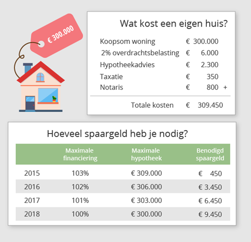 Voor de koop van een eigen huis kun je een hypotheek afsluiten. Voor de bijkomende kosten heb je echter wat spaargeld nodig. Vanaf 1 januari 2016 mag je namelijk nog maximaal 102% van de koopsom van je huis lenen. In 2017 en 2018 wordt de maximale hypotheek verder afgebouwd, naar 101% en uiteindelijk 100% van de koopsom.