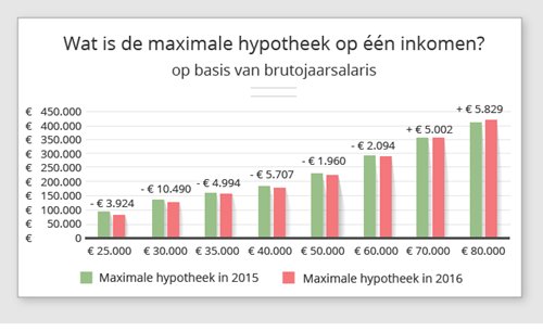 Zoals ieder jaar, zijn ook in 2016 de rekenmethodes omtrent de maximale hypotheek weer iets veranderd. De wijzigingen zijn dit jaar minimaal. Het zijn met name alleenstaanden die iets minder kunnen lenen. Een hypotheek op één inkomen geeft het volgende plaatje: