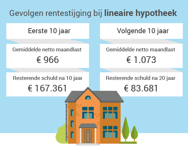 Marco en Babet sluiten in 2016 een hypotheek met een lineaire aflossing van € 250.000. De rente bedraagt 2,1 procent voor 10 jaar vast. Onderstaand de gevolgen van hun hypotheeksituatie als de rente over 10 jaar 5 procent bedraagt.Â