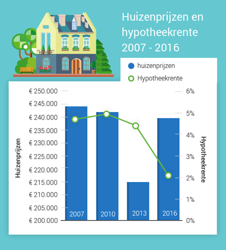 Het grote aantal huizenverkopen in 2007 is best bijzonder. De gemiddelde huizenprijs van toen en nu wijkt niet veel af. Nu kost een huis gemiddeld € 239.500. Dat scheelt nog geen € 5.000. Maar de hypotheekrente was destijds een stuk hoger.
