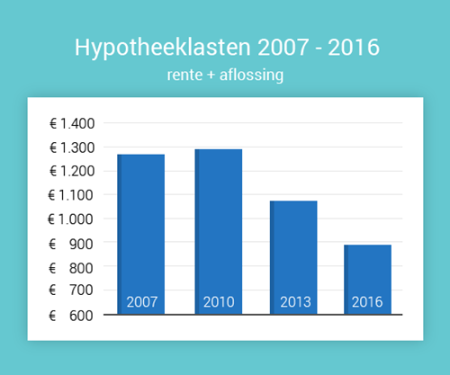 Een koophuis anno 2016 is uitstekend betaalbaar. Dat wordt met name duidelijk wanneer we de hypotheeklasten van dit moment vergelijken met de lasten van de afgelopen jaren. Gemiddeld betalen we nu voor een huis € 890 bruto per maand aan hypotheeklasten. In 2007, gedurende de vorige piek van de huizenmarkt, was dat nog € 1.270.