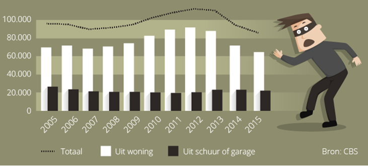Dat je niet de enige bent waar ingebroken wordt, blijk wel uit de volgende infographic. Vorig jaar werd er in precies 85.885 huizen en schuren ingebroken. Dat zijn er behoorlijk wat, maar tegelijkertijd ligt hiermee het aantal inbraken op het laagste niveau sinds in 2005!