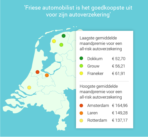 Mensen in Friesland zijn het goedkoopst uit voor hun autoverzekering, zo blijkt uit onderzoek onder verzekeraars.Â