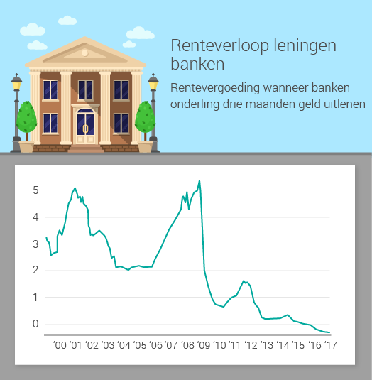 Als banken geld aan elkaar uitlenen, krijgen ze daar geen rentevergoeding over. Sterker nog, een bank moet zelfs betalen voor het parkeren van geld bij een andere bank. Dit is één van de redenen dat de spaarrente die jij ontvang bijzonder laag is. Een bank geeft jouw geen hogere rente nu het lastiger is om er winst op te maken door het weer uit te lenen.Â