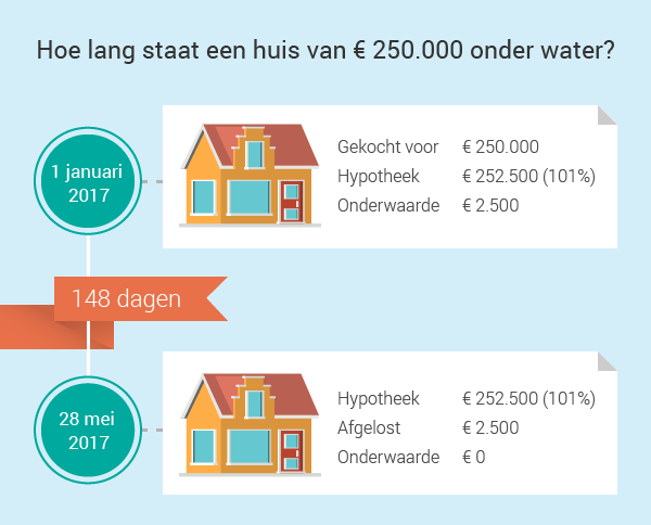 De angst lijkt overdreven. Stel je koopt een huis van € 250.000. In 2017 mag je maximaal 1 procent méér lenen dan de woningwaarde. Dat is € 2.500. Bij een annuïteitenhypotheek met een rente van 2 procent, heb je na één jaar € 6.145 afgelost. Koop je op 1 januari een huis, dan staat die vanaf 28 mei niet meer onder water. Minder dan vijf maanden dus.