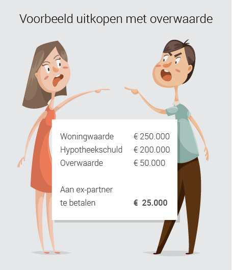 Wil je de ander uitkopen, dan gaat daar een woningtaxatie aan vooraf. Is de actuele woningwaarde hoger dan de hypotheek, dan is er sprake van overwaarde. Degene die in het huis blijft wonen, betaalt de ander het bedrag waar hij volgens de eigendomsakte recht op heeft. Meestal is dat 50 procent van de overwaarde. Bij een lagere woningwaarde dan de hypotheekschuld (onderwaarde), is de betaling andersom: degene die vertrekt, betaalt de ander de helft van de restschuld.