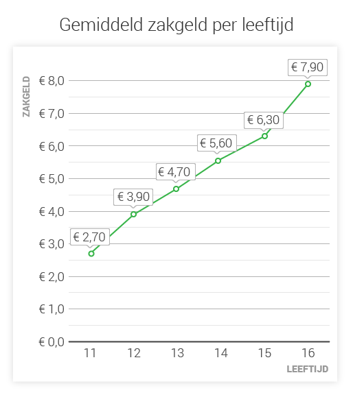 Ruim 91% krijgt wekelijks een vast bedrag van zijn ouders. Is een kind 11 jaar, dan is dat gemiddeld € 2,70. Dit loopt met stappen op naar € 7,90 voor 16-jarigen. Kleedgeld ligt tussen de € 40 en € 65 per maand. Geen grote bedragen, wel voldoende om je kinderen te laten wennen aan een financiële huishouding.Â