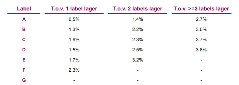 Huizen kunnen een energielabel hebben variërend van A tot G. Het meest energiezuinig is A, bij G ben je zeker van een hogere energierekening. De gemiddeld 2 procent hogere verkoopprijs geldt bij een één stap hoger label. Het prijsverschil loopt op als er meer stappen tussen zitten, bijvoorbeeld bij een A-label in plaats van C. Bij een verbetering van drie of meer stappen ligt de gemiddelde verkoopprijs 3.8 procent hoger.