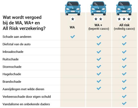 Bij de autoverzekering heb je drie mogelijkheden: WA, WA+ en Allrisk. Allrisk is de duurste optie. Uiteraard staat daar ook de meest uitgebreidere dekking tegenover.