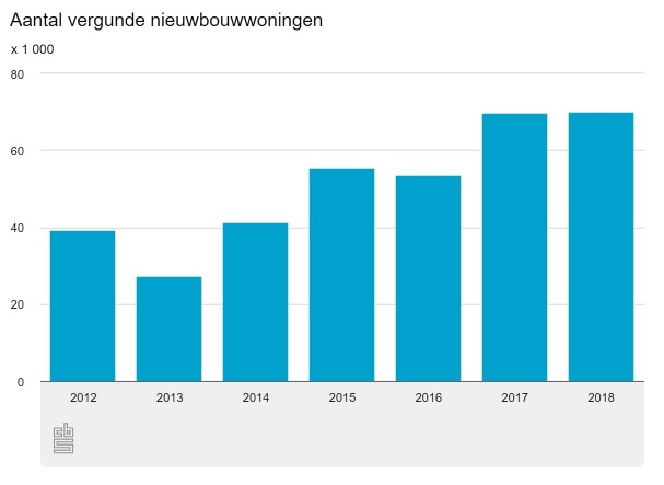 Het aantal afgegeven vergunningen dat vorig jaar werd afgegeven, is nagenoeg gelijk aan dat van 2017. In vergelijking tot de voorgaande vijf jaar ligt het aantal fors hoger. Het ligt anders als we verder teruggaan naar de periode voor de crisis. De periode tussen 2000 en 2008 kende een jaarlijks gemiddelde van 80.000 aangevraagde bouwvergunningen.
