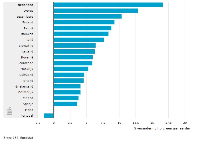De prijs van energie ligt in Nederland 16,7 procent hoger dan een jaar eerder. Daarbij gaat het om de energie die we in en rond huis gebruiken. In ons land zijn dit vooral gas en elektriciteit. In andere landen worden ook andere brandstoffen verstookt, waaronder huisbrandolie.