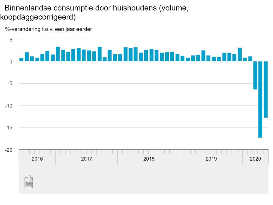 In de cijfers over mei zijn nog veel lockdown maatregelen van de overheid zichtbaar. Afwachten is wat de huidige ‘anderhalve meter economie’ voor gevolgen heeft. Die invloed wordt pas in komende rapporten van het CBS zichtbaar.Â