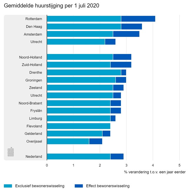 De huurstijging van vrijesectorwoningen is dit jaar juist lager: 3,0 procent nu tegen 3,3 procent in 2019. Bij bijna 18 procent van de vrijesectorwoningen bleven de huren dit jaar gelijk, vorig jaar was dit bij ruim 7 procent.