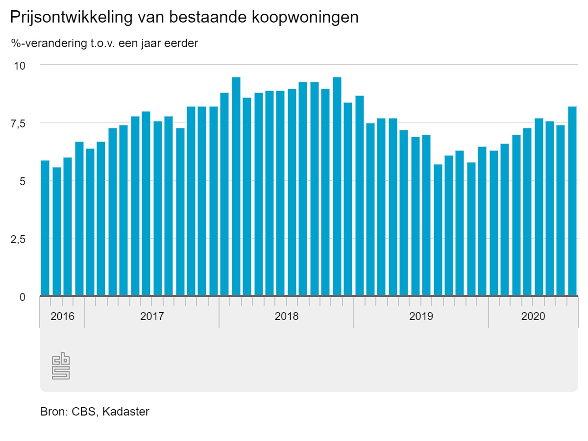 Van verkoeling op de woningmarkt is nog geen sprake, gezien de cijfers van het Kadaster over augustus. In die maand waren bestaande koopwoningen 8,2 duurder dan in dezelfde maand een jaar eerder. Het gaat om de grootste stijging in ruim anderhalf jaar. Wel daalde het aantal verkopen licht. Â