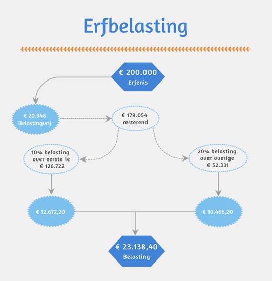 Evert laat aan zijn zoon Erik een grote erfenis van €200.000 na. Van dit bedrag is €20.946 vrijgesteld van belasting. Het bedrag waarover hij belasting moet betalen is €179.054. Over de eerste €126.722 betaalt hij 10 procent belasting, ofwel €12.672,20 . Over de laatste €52.331 betaalt hij 20 procent belasting, wat €10.466,20 is. In totaal betaalt Erik €23.138,40 belasting.Â