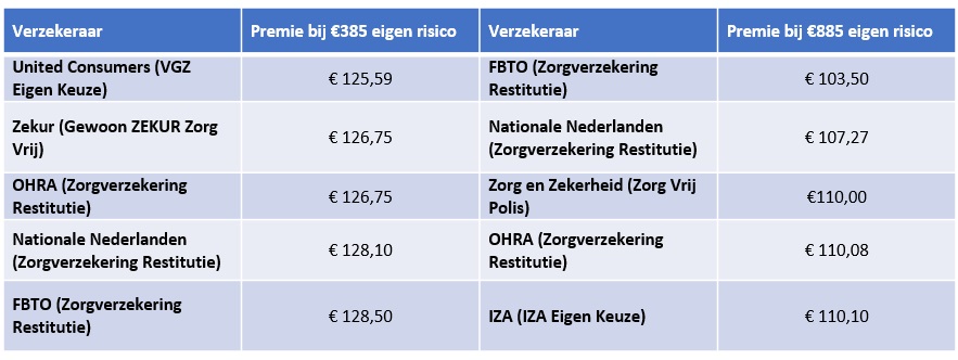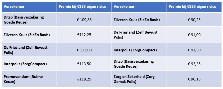 Onderstaand de laagste premies bij het standaard eigen risico en het maximaal verhoogde eigen risico van € 885.Â