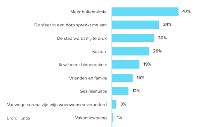 Kopers zoeken vooral naar een woning in een dorp omdat zij meer buitenruimte willen of de sfeer van een dorp prettig vinden. Ook de drukte van de stad is een belangrijke beweegreden, gevolgd door kosten. Een gewijzigde gezinssituatie en corona worden relatief weinig genoemd als reden om te verkassen naar een meer landelijke omgeving.