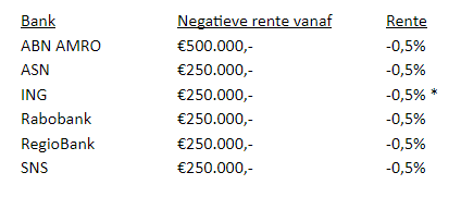 Al in 2014 rekende de eerste Duitse banken een negatieve rente aan zakelijke klanten. Particuliere Nederlandse spaarders konden gerust zijn, was toen de boodschap van banken van eigen bodem. Ondanks deze geruststelling is het inmiddels een feit. Bovendien schuift de grens verder op nu ING die de drempel verlaagt van €250.000 naar een ton.