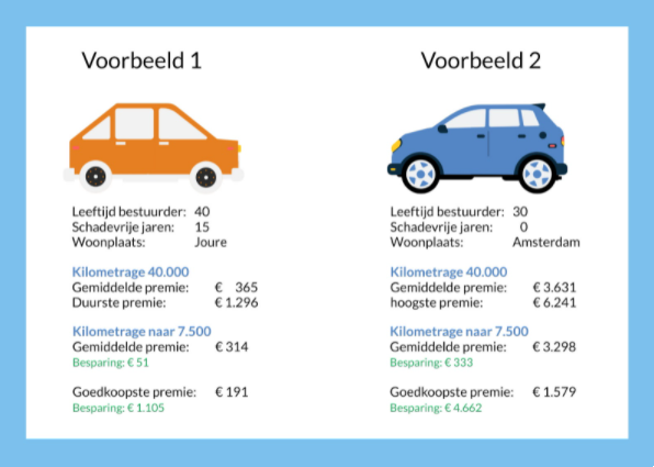 Uit onderzoek van MoneyView blijkt dat je flink kunt besparen als je verwacht minder te rijden komend jaar. Om inzichtelijk te maken wat je kunt besparen, zijn twee profielen opgesteld. Eén profiel met een goedkopere auto en gunstige omstandigheden, zoals veel schadevrije jaren en woonplaats in een rustig dorp. Het andere profiel is minder gunstig en heeft een duurdere auto, geen schadevrije jaren en als woonplaats Amsterdam.Â