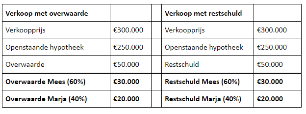Wanneer je beiden eigenaar bent van de woning, verdelen jullie bij verkoop de winst of het verlies. Hoeveel je krijgt uitgekeerd of hoeveel je moet betalen, is afhankelijk van de eigendomsverhouding van de woning. Meestal is er sprake van een gelijke verdeling. In dat geval krijg of betaal je de helft. Maar soms is bij aankoop van de woning een andere verdeling afgesproken. Dan krijg / betaal je op basis van deze verdeling. Onderstaand een voorbeeld van een stel waarbij Mees voor 60% eigenaar is van de woning en Marja 40%. Â