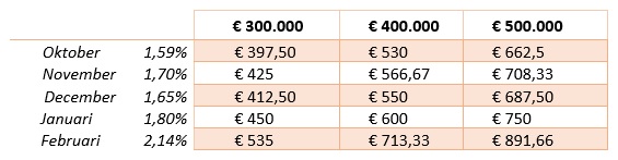 Je ziet dat toenemende rentes flinke impact kunnen hebben op de bruto rentelasten. Als voorbeeld nemen we een hypotheek van vijf ton en een rentevaste periode van 20 jaar. In februari betaalde je een €237,50 hogere bruto rente dan wanneer je afgelopen oktober de rente had vastgezet. Bij een hypotheek van drie ton en rentevaste periode van tien jaar is het verschil €137,50 bruto per maand.