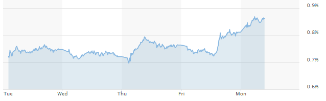 In de afgelopen week zet de stijging van de rente op staatsobligaties stevig door. Inmiddels staat er een rente rond de 0,86 op de teller. In vijf dagen is de rente 0,13 procent opgelopen. Naarmate we verder terugkijken neemt het verschil toe. Eind vorig jaar was er zelfs sprake van een negatieve rente op staatsobligaties met een looptijd van tien jaar. Met andere woorden, toen betaalde je als investeerder om je geld te parkeren bij de staat.