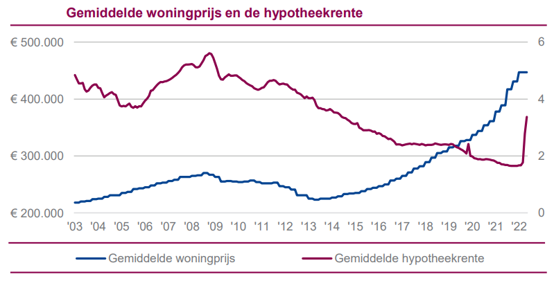 De bruto maandlasten worden bepaald door de prijs van woningen en de hoogte van de hypotheekrente. Eind vorig jaar was de gemiddelde verkoopprijs van een woning nog € 396.848, waar er in april al € 429.020 betaald werd. De gemiddelde hypotheekrente bedraagt inmiddels ruim 3 procent, fors meer dan de nog geen 2 procent in januari. Onderstaande zie je de ontwikkeling zowel de rente als huizenprijzen in de afgelopen twee decennia.