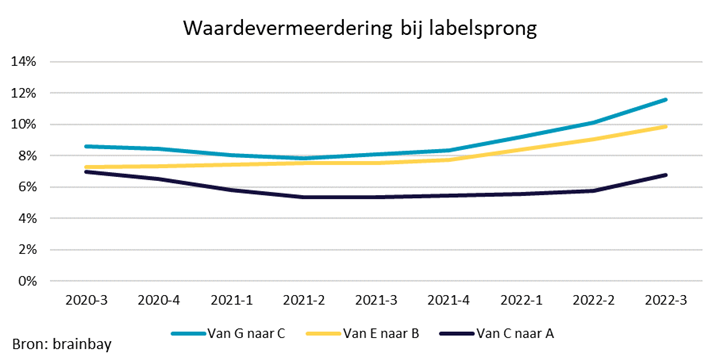 Afgelopen juli leverde een woning met label C gemiddeld 7,9% meer op dan een vergelijkbare woningen met een G-label. Het verschil is inmiddels opgelopen naar 11,6%. Met de actuele gemiddelde woningprijs kan het gaan om waardeverschil van bijna 50.000 euro. Vooral woningen die promoveren van een G naar C label profiteren van een hogere woningwaarde.