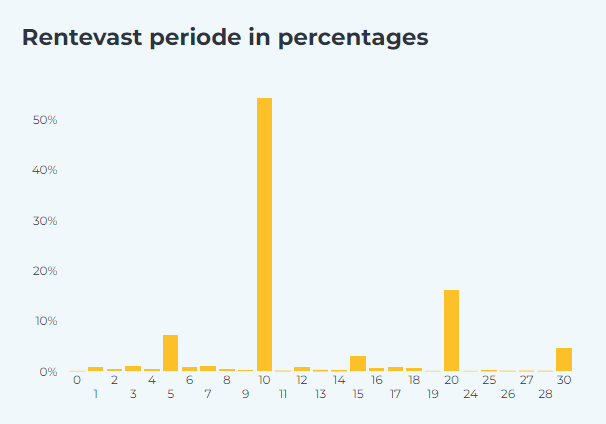 Uit de meest recente weekanalyse van HDN blijkt dat verreweg (54,47% van het totaal) de meeste hypotheekoffertes worden aangevraagd met een 10 jaar vast rentetermijn. Op gepaste afstand (16,25%) volgt 20 jaar. Voor de zekerheid van een langere rentevast termijn betaal je over het algemeen een hogere hypotheekrente. Door de rentestijging in het afgelopen jaar was vooral 10 jaar in trek en zagen we ook een opkomst van de 5-jarig termijn. Deze trend staat deels haaks op de bevindingen van de Nederlandsche Bank. Toch blijft staan dat Nederlandse huishoudens graag kiezen voor zekerheid, ook als dat iets kost in de vorm van een hogere hypotheekrente.